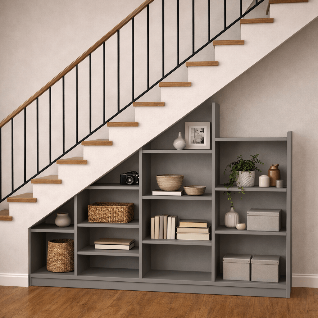 Ce meuble sous escalier sur mesure avec étagères est idéal pour transformer un espace souvent inexploité en zone de rangement pratique et esthétique. Grâce au sur-mesure, chaque détail est entièrement personnalisable : dimensions, finitions et agencement des étagères, afin de créer un meuble unique parfaitement adapté à la configuration de votre escalier. Vous optimisez ainsi chaque recoin tout en apportant une touche élégante à votre intérieur.